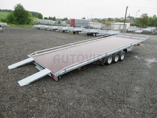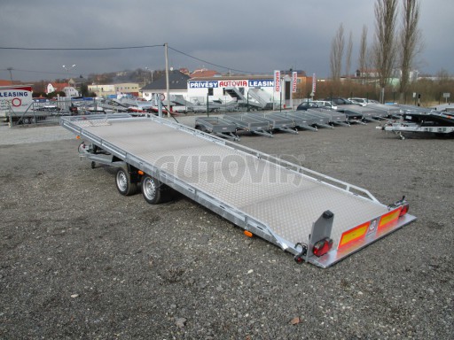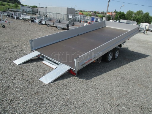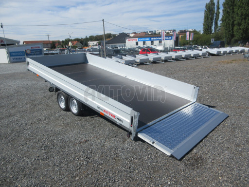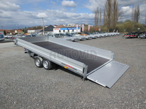 Vzduchem brzděný jednoosý valník vhodný pro přepravu stavební mechanizace, bagrů, nosnost 7800kg, ložná plocha 12europalet. Na přívěs lze vyrobit plachtu včetně konstrukce do výšky 4,0m, podlaha 21mm, odnímatelné a sklopné eloxované bočnice 400mm. Vzduchové pérování zajišťuje vysoký kilometrický proběh pneumatik a komfortní jízdní vlastnosti. Záruka 12 měsíců, možnost pneumatického snížení nájezdového úhlu.