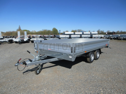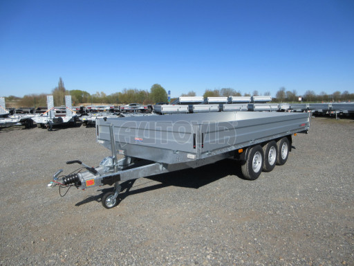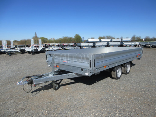 Dvounápravový třístranný sklápěč určený pro převoz sypkých materiálů, paletového zboží, bagrů a mechanizace. Elekrické ovládání hydraulického sklápění s vlatním výkonným akumulátorem. Konstrukci tvoří celosvařovaný žárově zinkovaný pevnostní rám s celokovovou robustní podlahou z pozinkovaného plechu tl. 3mm. Hliníkové eloxované bočnice o výšce 300mm + zadní kombinované čelo s podsypem, sklopné a plně odnímatelné včetně sloupků - možnost provedení plato, německé nápravy a nájezdová brzda AL-KO/KNOTT SRN. Přívěs má vysokou konstrukční nosnost. Možnost dokladového snížení celkové hmotnosti v TP!