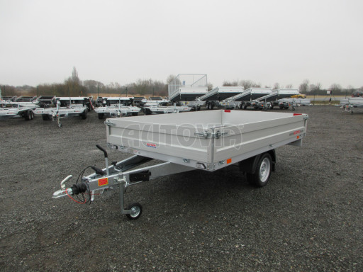 Dvounápravový třístranný sklápěč určený pro převoz sypkých materiálů, paletového zboží, bagrů, mechanizace. Žárově zinkovaný rám, kola 185R14C, možnost domontování plachty včetně konstrukce. Možnost provedení plato bez bočnic a sloupků - přední čelo otevírací. Sklápění pomocí elektrohydraulického agregátu, ruční nouzová pumpa. Výška bočnic 350mm, zadní kombinované čelo s podsypem.